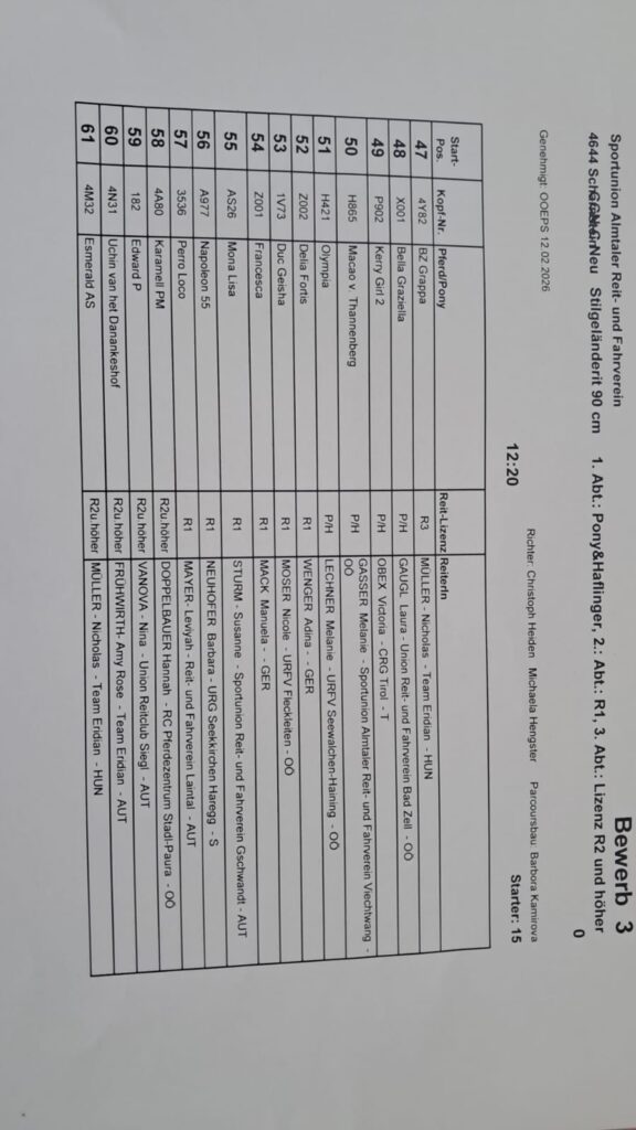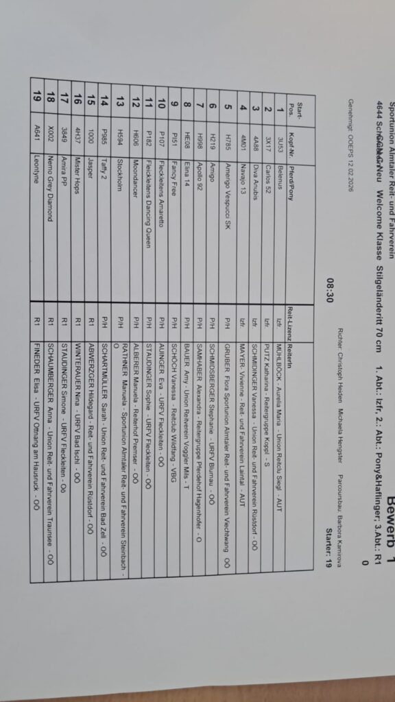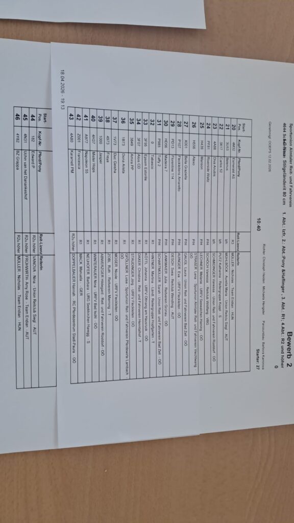 Startlisten Geländeritt 19.04.2026 by Nicole Strasserupdated on 18. April 2026Leave a Comment on Startlisten Geländeritt 19.04.2026 Die Startlisten für unseren morgigen Geländeritt sind online. ACHTUNG: Besichtigung mit Pferd morgen von 07:45 – 08:15. Wasserdurchritt mit dem Pferd im Schritt ist erlaubt