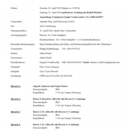 Am Wochenende wurden auf unserer Anlage die Vereinsmeister im in Dressur, Springen sowie dem Fahren ermittelt. Wir gratulieren allen frisch gebackenen Vereinsmeister und Teilnehmern zu ihrer Leistung und wünschen viel Erfolg für das Jahr 2026